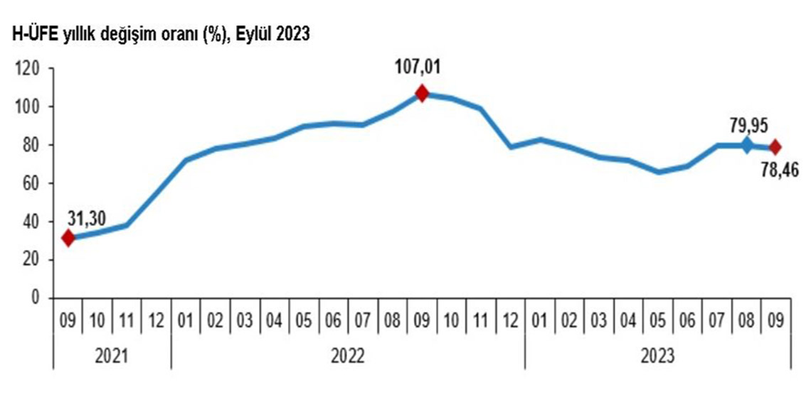 TÜİK, Eylül 2023 dönemine ilişkin hizmet üretici fiyat endeksi (H-ÜFE) verilerini açıkladı. Buna göre; ağustos ayında yıllık yüzde 79,95, aylık yüzde 5,25 arttığı açıklanan H-ÜFE, eylülde yıllık yüzde 78,46, aylık yüzde 1,70 arttı.
