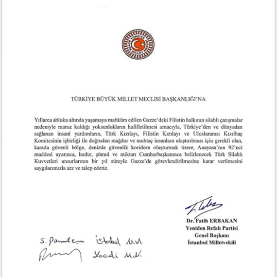 ‘Yıllarca abluka altında yaşamaya mahkûm edilen Gazze’deki Filistin halkının İsrail saldırıları nedeniyle maruz kaldığı yoksunlukların hafifletilmesi amacıyla, Türkiye’den ve dünyadan sağlanan insanî yardımların, Türk Kızılayı, Filistin Kızılayı ve Uluslararası Kızılhaç Komitesinin işbirliği ile doğrudan mağdur ve muhtaç insanlara ulaştırılması için gerekli olan, karada güvenli bölge, denizde güvenlik koridoru oluşturmak üzere, Anayasa’nın 92’nci maddesi uyarınca, hudut, şümul ve miktarı Cumhurbaşkanınca belirlenecek Türk Silahlı Kuvvetleri unsurlarının bir yıl süreyle Gazze’de görevlendirilmesine karar verilmesini saygılarımızla arz ve talep ederiz.’ Bu talebimizin bir an evvel Meclis’te oylanmasını ve mecliste temsil edilen tüm partilerin desteğiyle meclisimizin bu yönde bir karar almasını istiyoruz” ifadelerini kullandı.