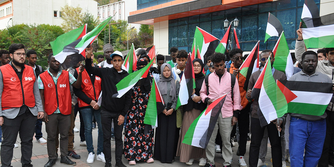 Gümüşhane Üniversitesi’nde Filistin’e yönelik saldırılarını sürdüren İsrail, protesto edildi. Kampüsteki camide yaşamını yitirenler için gıyabi cenaze namazı kılındı. Rektör Halil İbrahim Zeybek, akademisyenler ve öğrenciler Filistin halkı için dua etti. Namazın ardından üniversitedeki sosyal tesisin önünde toplanan 71 farklı milletten yabancı öğrenci, Filistin bayrağı açarak İsrail’i protesto etti. Kur’an-ı Kerim’in de okunduğu etkinlikte bazı öğrenciler gözyaşı döktü. Öğrencilerden Filistinli Ali Hasan Sukkar ile Çadlı öğrenci Boubakari Oumarou ortak bir yazılı basın açıklamasını okudu.