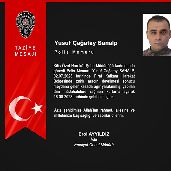 Emniyet Genel Müdürü Erol Ayyıldız tarafından Twitter’dan yapılan paylaşımda, “Kilis Özel Harekat Şube Müdürlüğü kadrosunda görevli Polis Memuru Yusuf Çağatay Sanalp, 02.07.2023 tarihinde zırhlı aracın devrilmesi sonucu meydana gelen kazada ağır yaralanmış, yapılan tüm müdahalelere rağmen kurtarılamayarak 16.08.2023 tarihinde şehit olmuştur. Aziz şehidimize Allah’tan rahmet, ailesine ve milletimize baş sağlığı ve sabırlar dilerim” denildi.