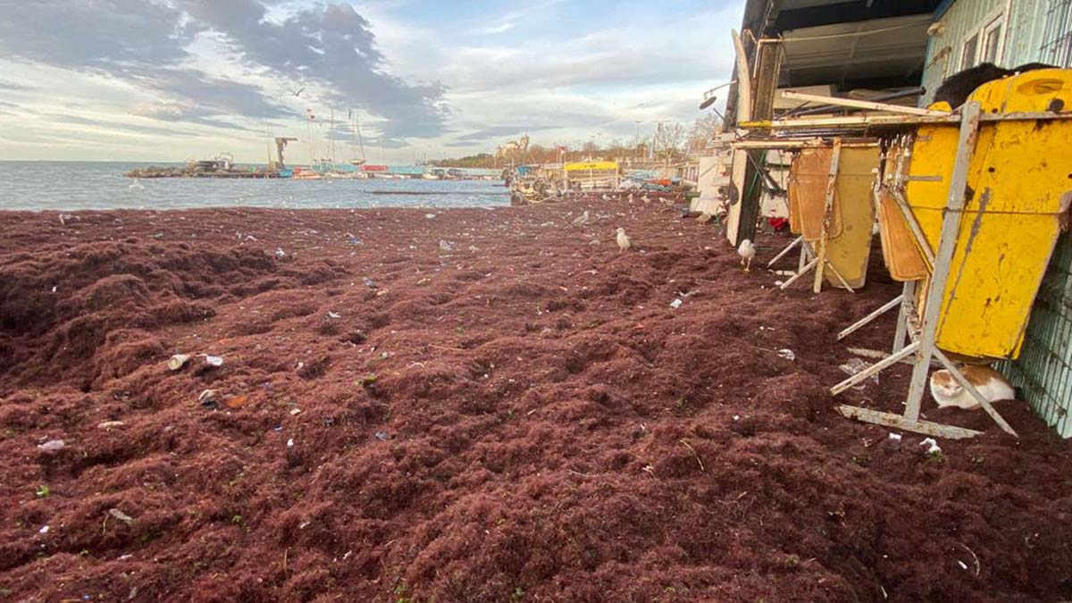 İstanbul‘da dün akşam saatlerinden itibaren etkili olan fırtına ve yağmur nedeniyle Kadıköy Caddebostan sahilini yine kırmızı yosunlar kapladı. Sahile vuran dev dalgalar nedeniyle kırmızı renkli yosunlar sahildeki kayalıklara ve yürüyüş yolunu kapladığı görüldü. Yosunları temizlemek için İstanbul Büyükşehir Belediye Ekipleri sabah saatlerinden itibaren çalışmaya başladı. Caddebostan sahilinde sabah yürüşü yapan Emine Kaysel, “Yürüyüş yollarındaki yosunları ilk defa gördüm. Geçen fırtınada vardı. Sabah saatlerinden itibaren belediye ekipleri de sahil kısımlardaki yosunları temizlemeye çalışıyorlar. Sahil boyunca çok kırmızı yosun var” dedi.
