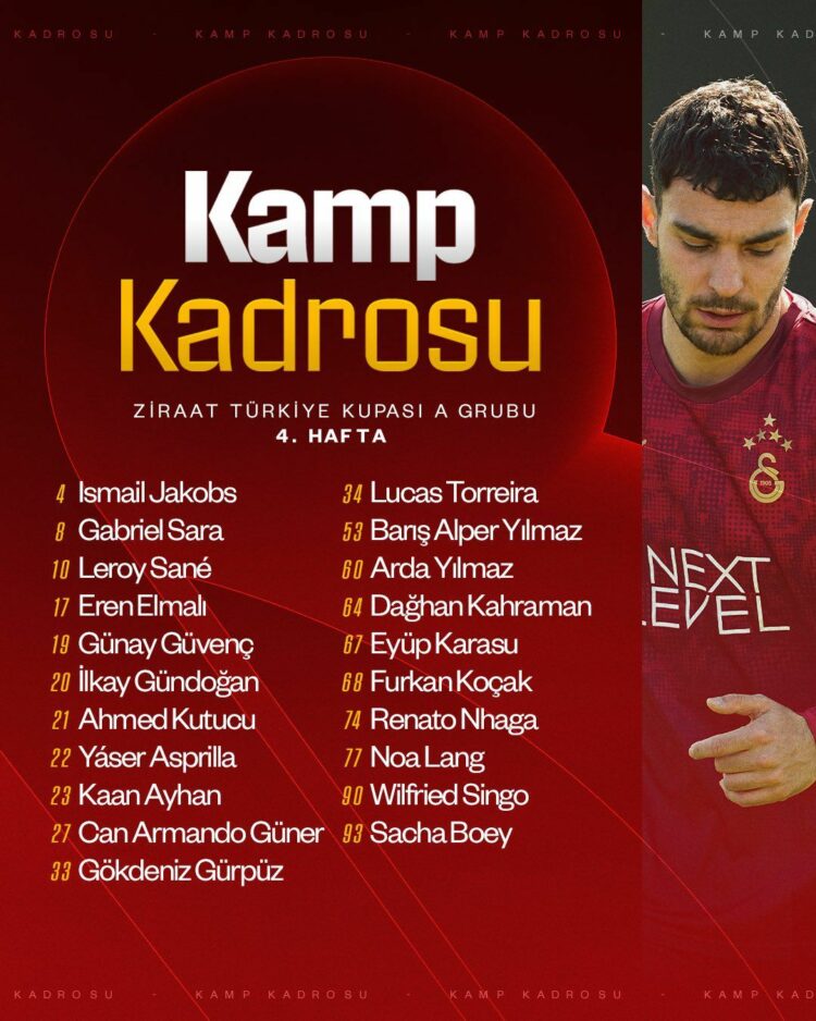 “Ismail Jakobs, Gabriel Sara, Leroy Sane, Eren Elmalı, Günay Güvenç, İlkay Gündoğan, Ahmed Kutucu, Yaser Asprilla, Kaan Ayhan, Can Armando Güner, Gökdeniz Gürpüz, Lucas Torreira, Barış Alper Yılmaz, Arda Yılmaz, Dağhan Kahraman, Eyüp Karasu, Furkan Koçak, Renato Nhaga, Noa Lang, Wilfried Singo, Sacha Boey.”