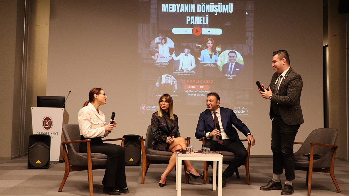 İstanbul Kent Üniversitesi’nde Medyanın Dönüşümü Paneli düzenlendi. Muhabir Hazan Kutsal Çeliksoy, bir medya grubunun Yönetim Kurulu Başkanı Muammer Kapucuoğlu ve haber program sunucusu Bahar Erensayın’ın katıldığı panelde; medyanın dönüşümüne dair değerlendirmelerde bulunuldu.