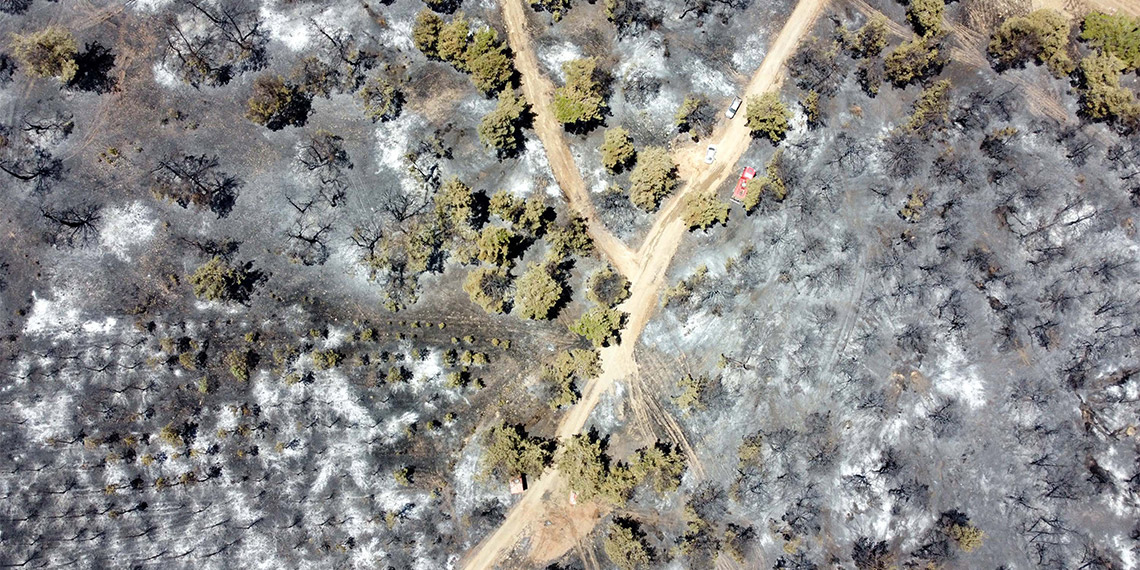 Yer yer soğutma çalışmaları sürerken, 58 hektar alanın zarar gördüğü bölge dron ile de görüntülendi.