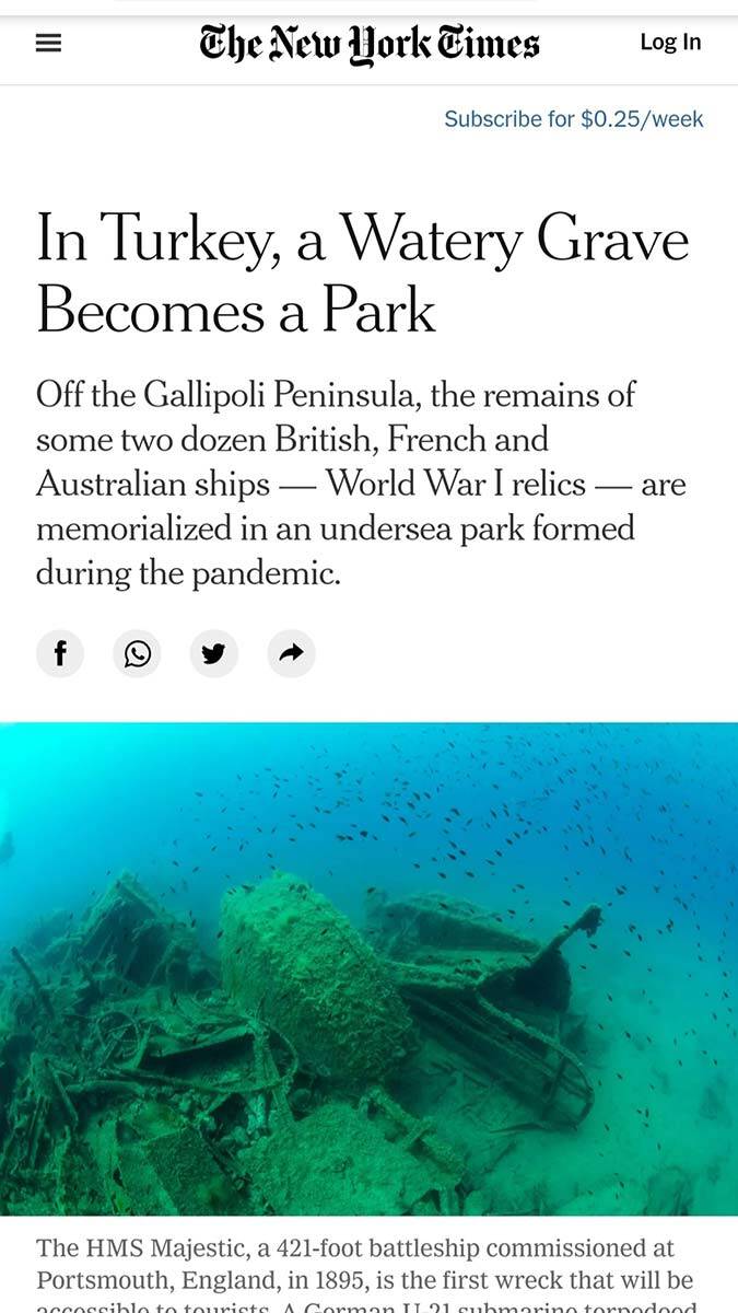Çanakkale Savaşları Gelibolu Tarihi Alan Başkanlığı’nca yürütülen Gelibolu Tarihi Sualtı Parkı, The New York Times gazetesine konu oldu. Dün gazetede yayınlanan haberde, Gelibolu Tarihi Sualtı Parkı hakkında bilgi verildi.