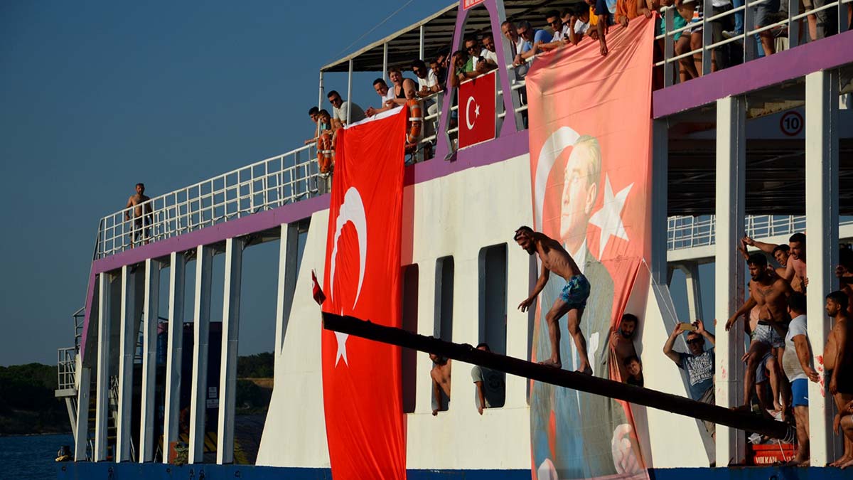 Çanakkale’nin Gelibolu ilçesinde 1 Temmuz Denizcilik ve Kabotaj Bayramı’nın 96’ncı yıl dönümü, düzenlenen deniz etkinlikleriyle kutlandı. Gelibolu Hamzakoy sahilindeki etkinlikler, saat 18.30’da Gelibolu Kaymakamlığı’na vekalet eden Eceabat Kaymakamı Mustafa Çiftçiler ve Belediye Başkanı Mustafa Özacar, deniz şehitlerinin anısına boğaza çelenk bıraktı ve ardından saygı duruşu ile istiklal marşının okunmasıyla başladı.