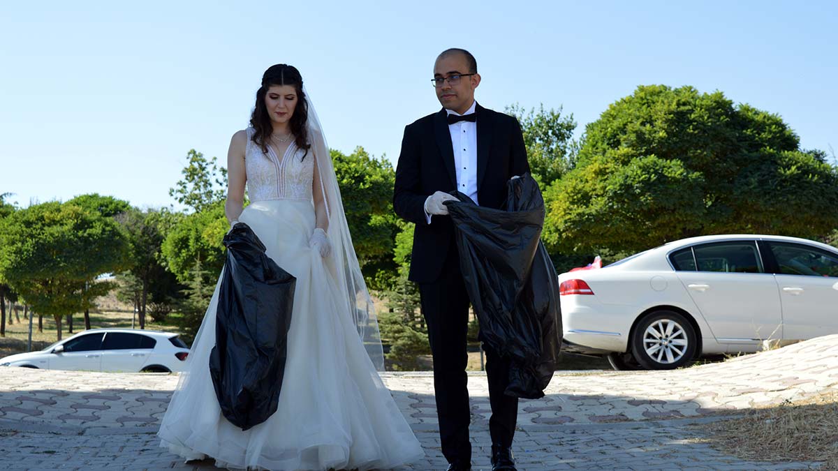 Van’ın Erciş ilçesinde dünyaevine giren yazılım test mühendisleri Ahmet Sadık Aras(24) ile Feyza Demirel (24) çifti, Van Gölü sahilinde çöp topladı.