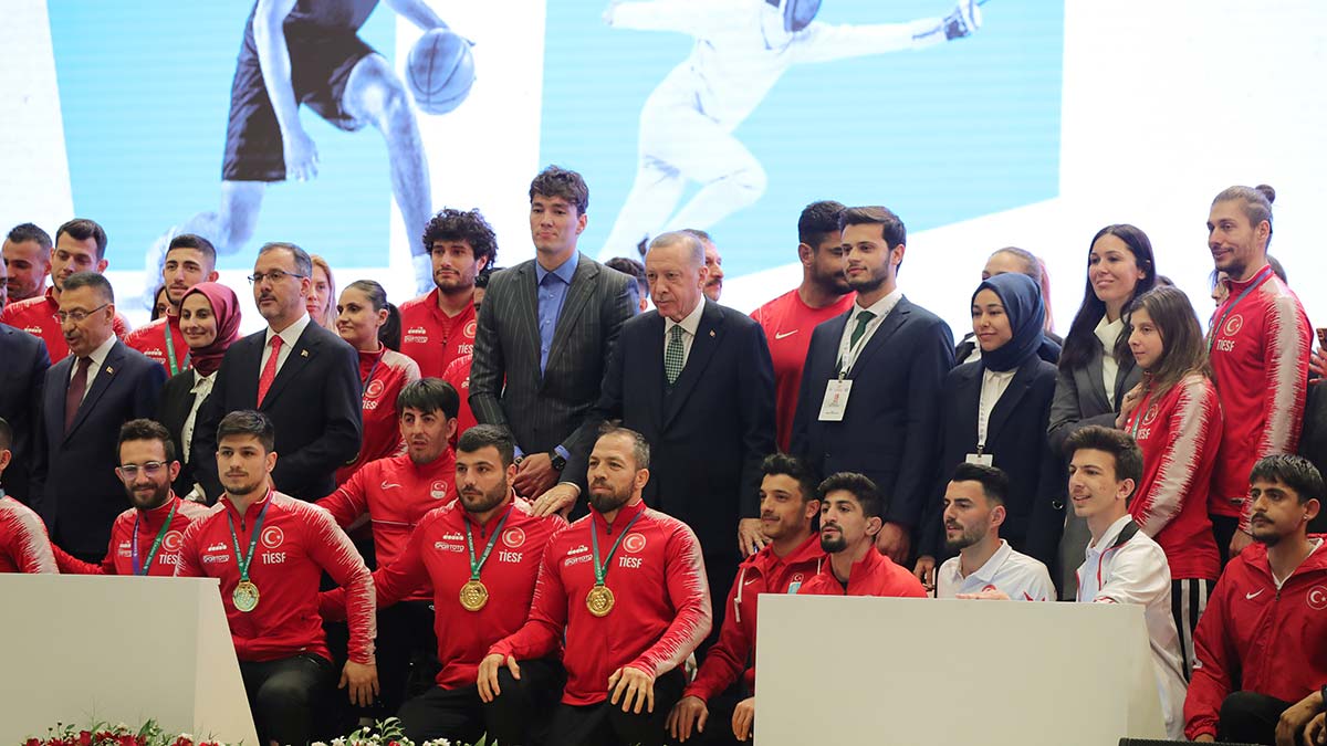Her alanda gençlerle bir araya geldiklerini vurgulayan Cumhurbaşkanı Erdoğan, “Ülkemizde sayıları iki buçuk milyonu bulan faal sporcularımızın içinden şanlı bayrağımızı göndere çekecek orada dalgalandıracak daha nice şampiyonlarımızın çıkacağına inanıyorum.
