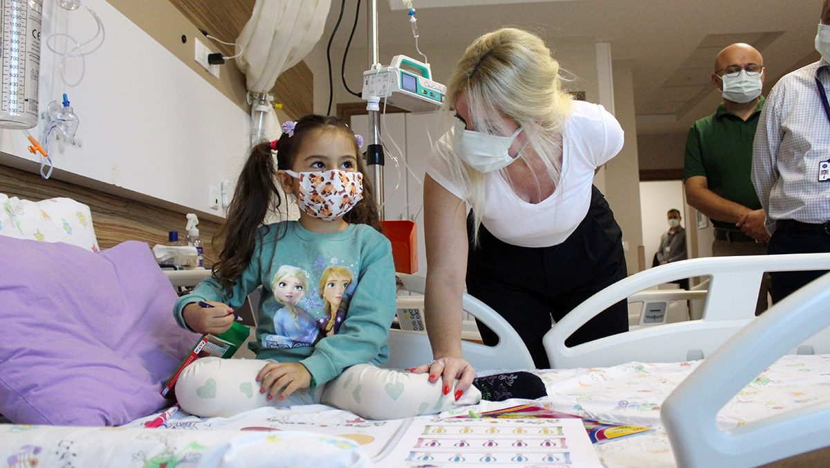 Çocuk Hematoloji ve Onkoloji Servisi’nde yatan çocukları ziyaret eden AÜ Rektörü Prof. Dr. Özlenen Özkan, “5 çocuğumuz tedavi olduktan sonra hasta arkadaşlarına motivasyon amaçlı video çekmişler. Çok kıymetli bir video. Onları motive etmek adına çekilen bir video. Bu videolar, çocuklara hatta ailelerine daha büyük umut oluyor. Çok güzel bir çalışma. Arkadaşlarımın fikriymiş; benim de çok hoşuma gitti. İnşallah sayı artar, daha büyük sayılarla daha güzel videolar çekeriz” dedi.