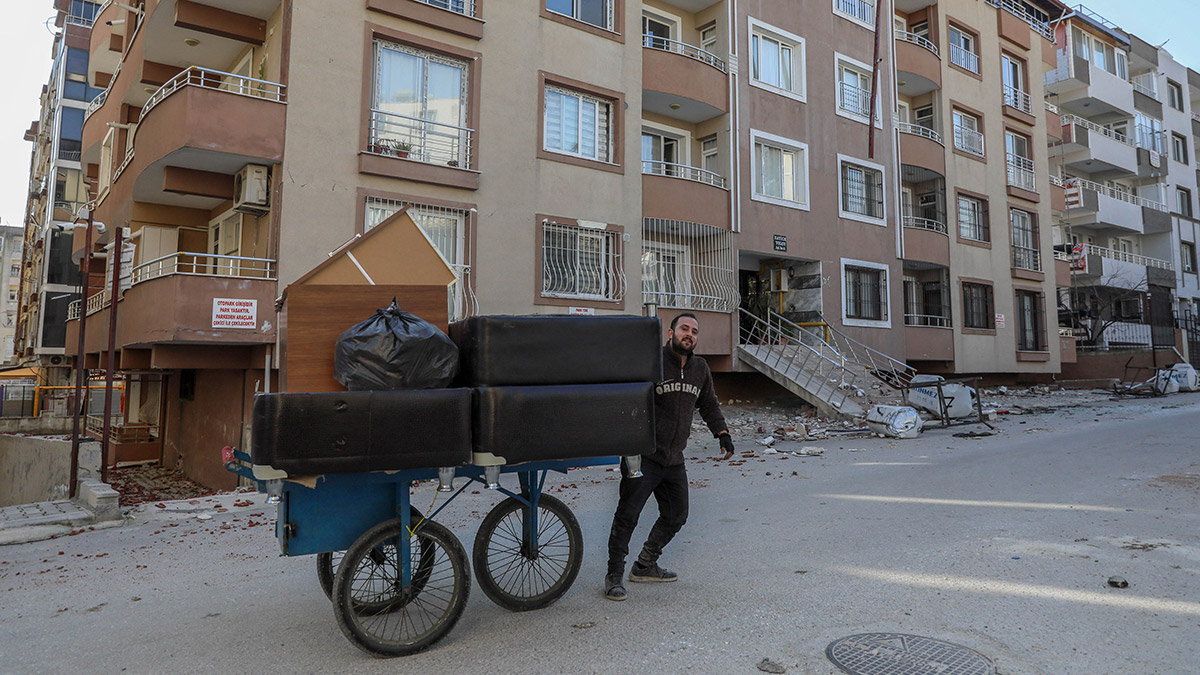 Depremin en çok yıkım ve hasara yol açtığı yerlerden Hatay’ın Antakya ilçesinde evleri hasar görenler, tehlikeye aldırış etmeden eşyalarını almaya çalışıyor. Kimileri hasarlı binalardaki eşyalarını iple aşağı sarkıtırken, birinin de yan yatan evinden indirdiği eşyalarını el arabasıyla çekerek götürdüğü görüldü.