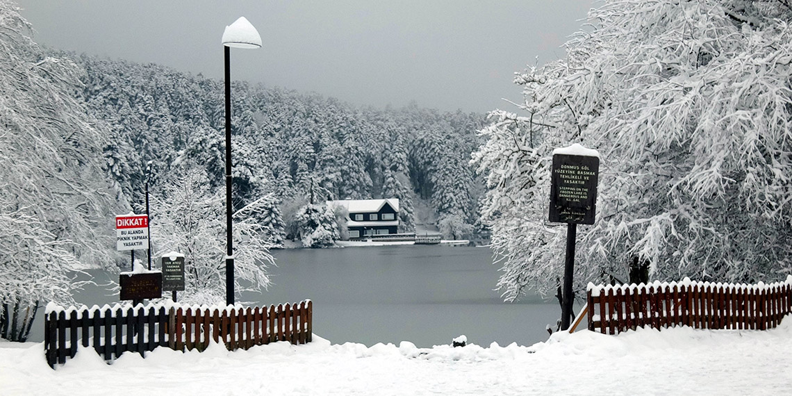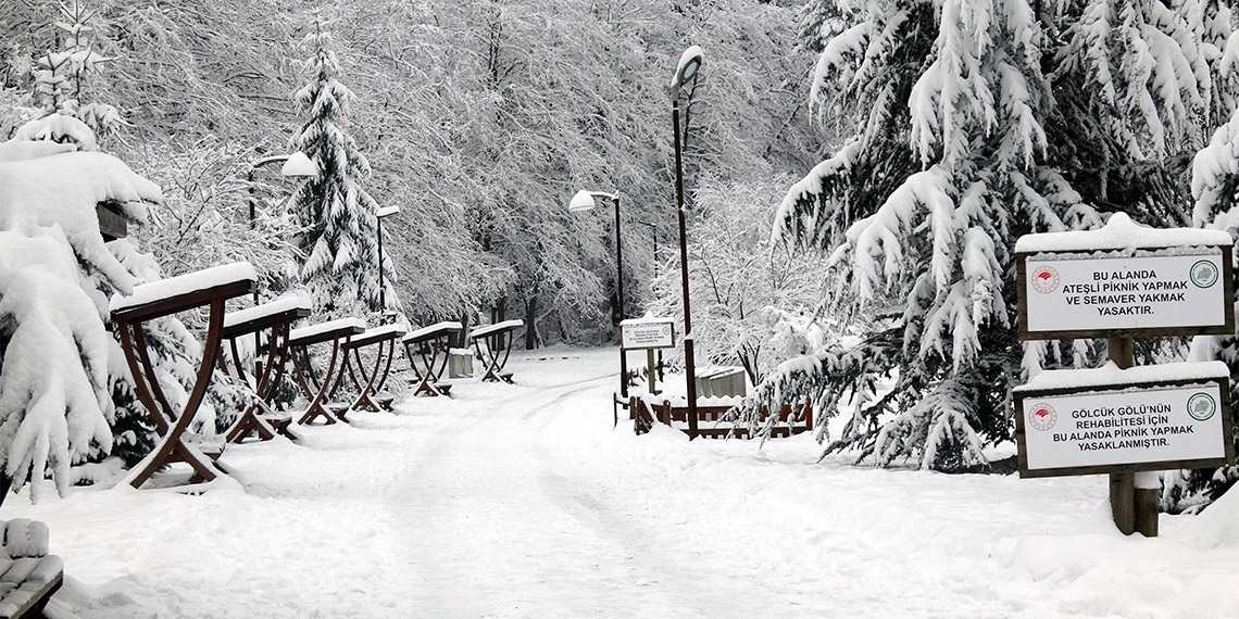 Tabiat parkını çevreleyen karla kaplı çam ormanları güzel manzaralar oluşturdu. Beyaz örtüyle kaplanan Gölcük’te kar kalınlığı yaklaşık 50 santime ulaştı.