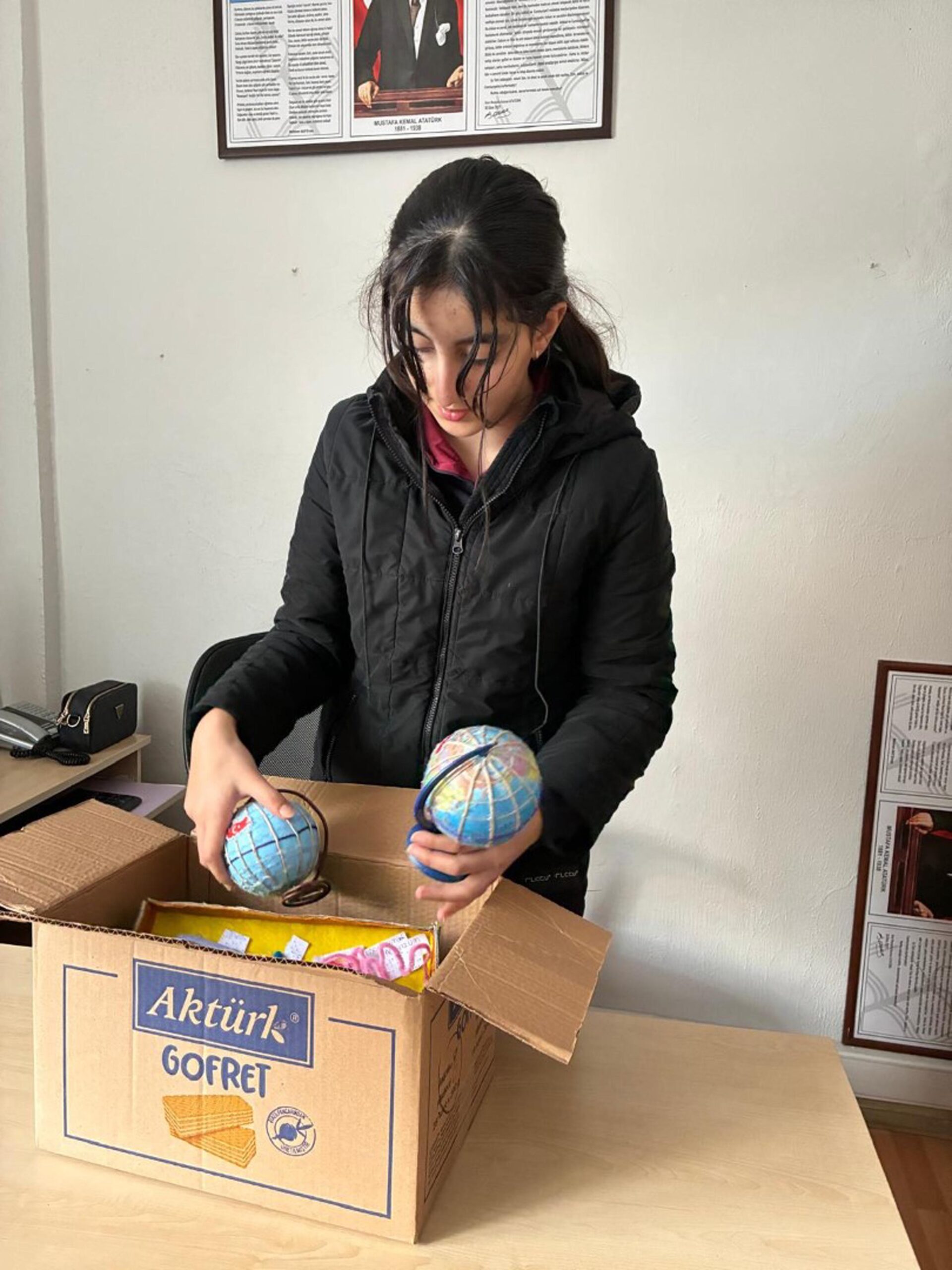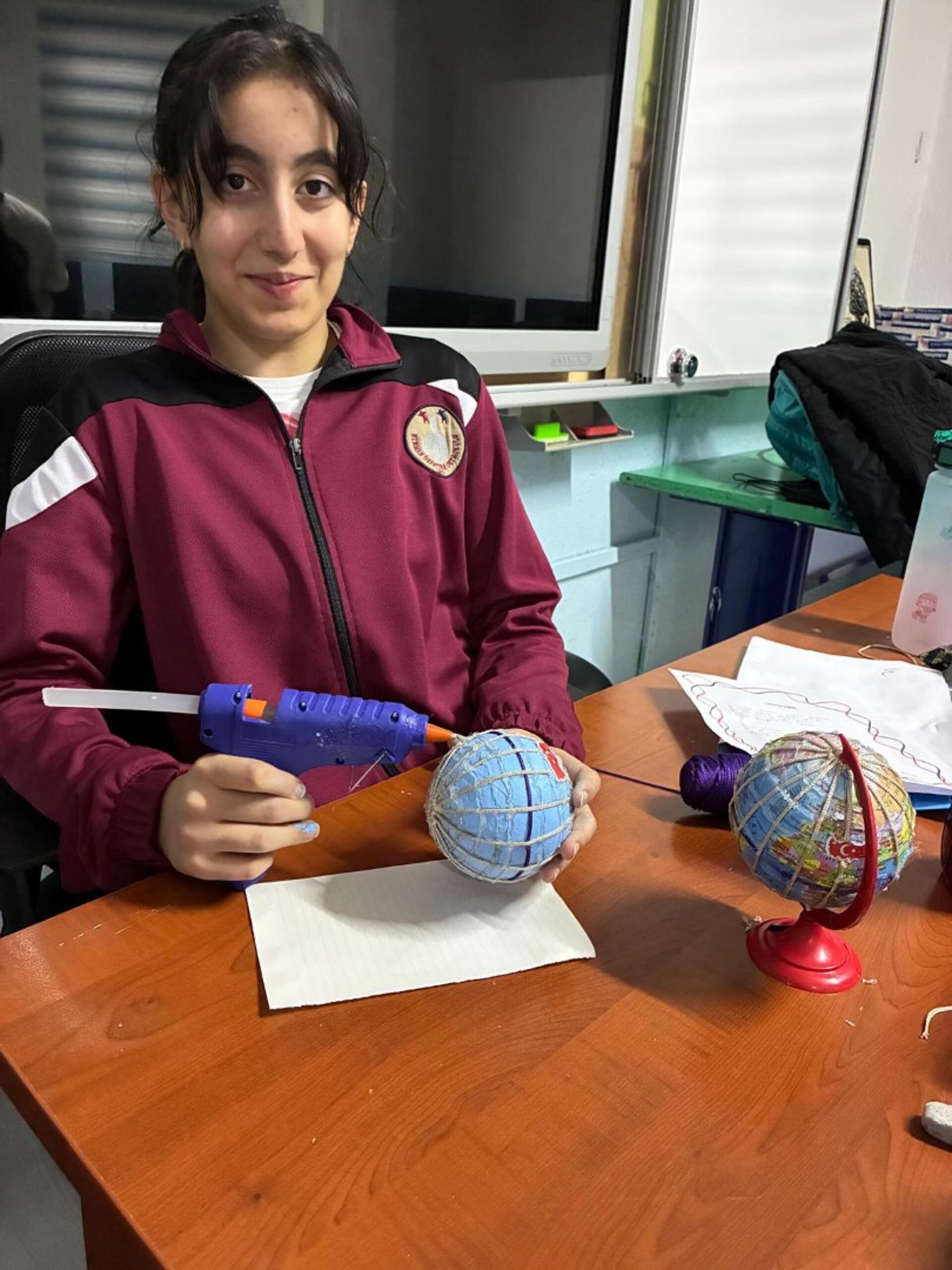 "Küreleri hazırlık sürecinde fikir alışverişinde bulunduk. İplerle yapabileceğimize karar verdik. Bu dünyaları satın aldık. Üstüne tek tek ipleri silikonladık. İlk başta zorlandık ama sonra elimiz alışmaya başladı. Biz konuyu öğrenirken de ilk başta zorlanmıştık. Sonra sonra küreleri yapmaya başlayınca bizim de bilgilerimiz pekişti. O çocuklarla birlikte yapmak, güzel bir duyguydu."