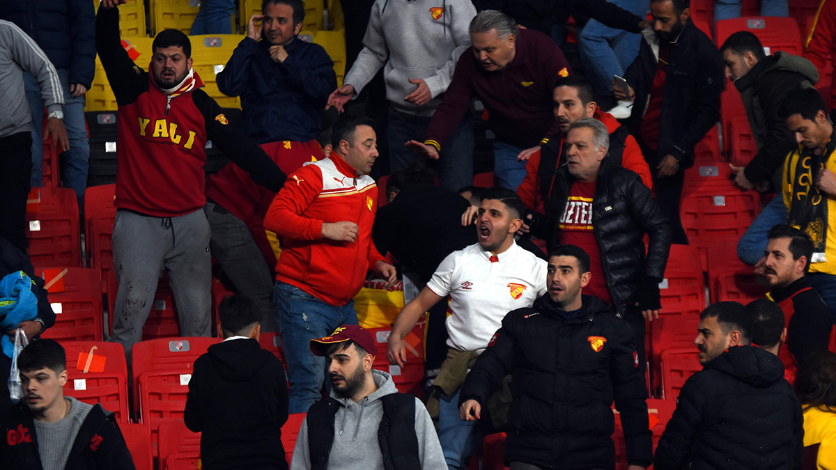 Bu sırada sahaya inen bir Göztepe taraftarı korner bayrağı direğini alarak Altay kalecisi Ozan’a saldırdı. Ozan’a darbeler indiren taraftar, polisin müdahalesiyle etkisiz hale getirilerek gözaltına alındı. Aldığı darbeler sonrasında Ozan baygınlık geçirdi. Güvenlik güçleri sahaya girerek olaylara müdahale etti.