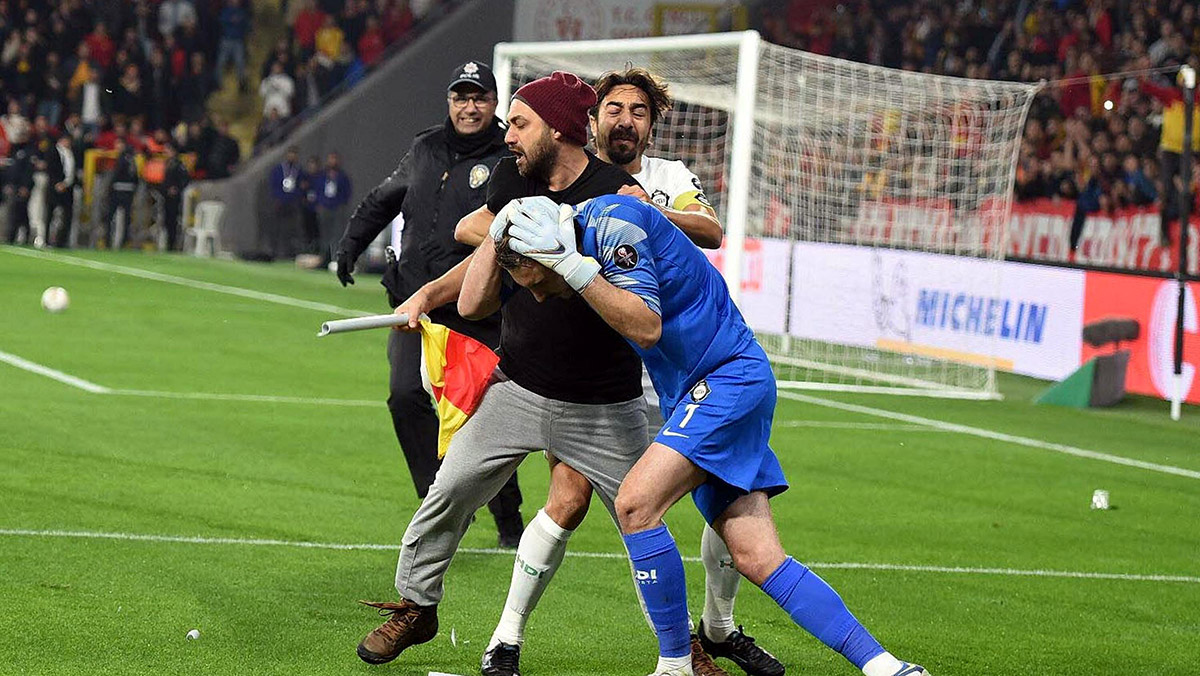 Sağlık ekipleri yaralıya müdahale ederken, sahaya atlayan Göztepe taraftarı Nihat Aydın, korner direğiyle rakip takımın kalecisi Ozan Evrim’e saldırdı. Evrim, başına aldığı darbeyle yaralandı. Her 2 yaralı da hastaneye kaldırıldı. Büyüyen olaylar nedeniyle maç, tatil edildi ve soruşturma başlatıldı.