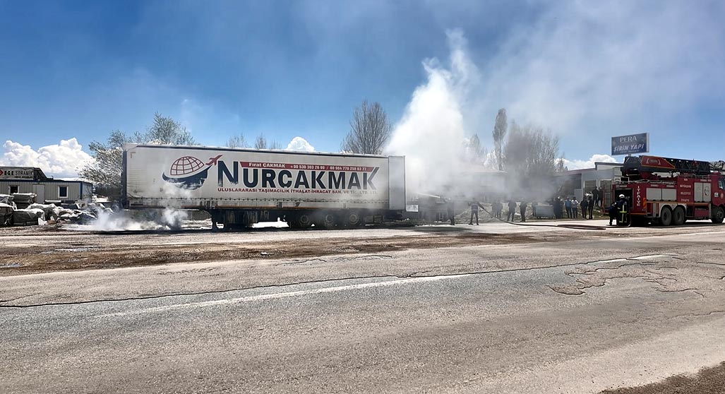Van’ın Erciş ilçesinde aniden seyir halindeyken alev alan gübre yüklü TIR’ın dorsesi zarar gördü.