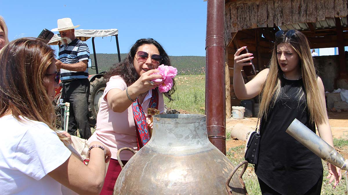 Bahçeden toplanan gül çiçekleri daha sonra ziyaretçilerin nezaretinde gülyağı çıkarılmak üzere bakır imbiğe dökülerek yağ çıkarılması uygulama ile gösterildi. Koku uzmanı Bihter Türkan Ergül uygulama öncesi katılımcılara bilgi verdi. Gül bahçelerinde topladıkları gülleri bakır imbiğe döken ziyaretçiler Osmanlı geleneklerine uygun olarak dua etti, dilek tuttu. ‘Geleceğiniz kadar parlak, gökyüzü kadar sonsuz olsun, eski gitsin yeni gelsin’ temennileri ile zemzem suyu da konulan imbiğe gül çiçekleri atıldı. Ardından yine geleneklere uygun olarak imbiğin ucuna konulan damacanaya tülbent bağlanırken dua edilerek genç kızlara dilekte bulundurularak seans tamamlandı.