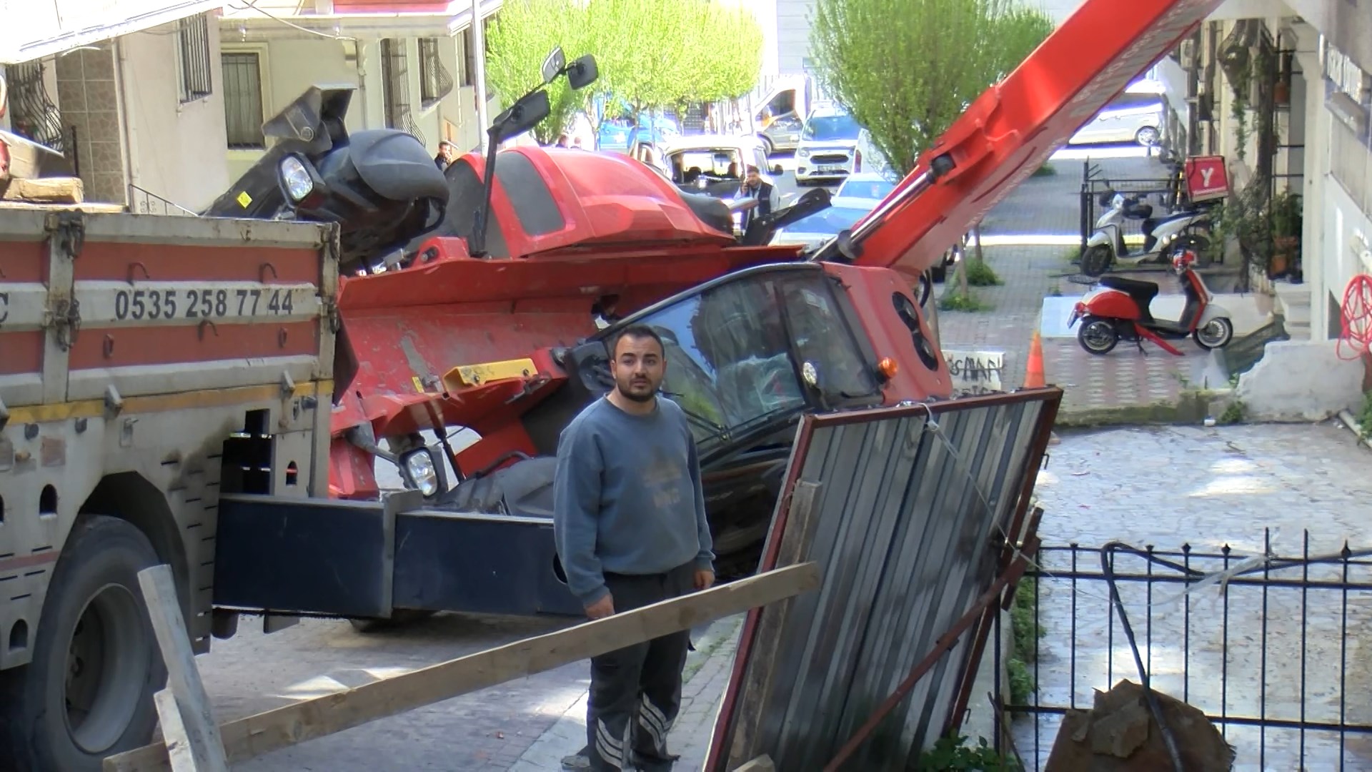 İş makinesi olay yerine çağırılan vinç yardımıyla bulunduğu yerden kaldırıldı. Esnaflık yapan Ramazan Aykut “Arkadaki iş yeri bizim ofisimiz. Grafik tasarım çalışması yaparken bir ses duyduk. Dışarı çıktığımızda iş makinesinin binaya doğru yaslandığını gördük. Operatör çıkmaya çalışıyordu. Onun dışarıya çıkmasına yardımcı oldum; bir sıkıntısı yoktu. Araçlarda ve vurduğu binada hasar var. Hasarla atlatılmış bir kaza” dedi.