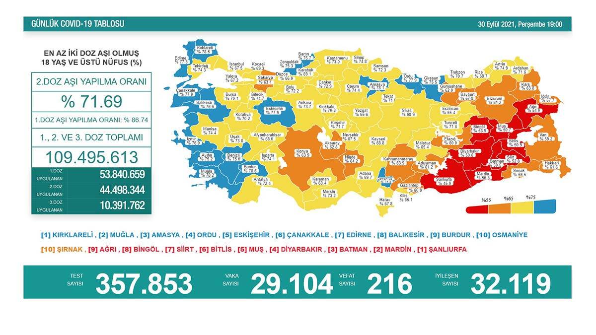 Sağlık Bakanlığı’nın açıkladığı ‘Günlük Kovid- 19 Tablosu’ verilerine göre; son 24 saatte yapılan 357 bin 853 testte 29 bin 104 vaka tespit edildi. Koronavirüs nedeniyle 216 kişi hayatını kaybederken, 32 bin 119 kişinin de tedavisi ve karantinası sona erdi.