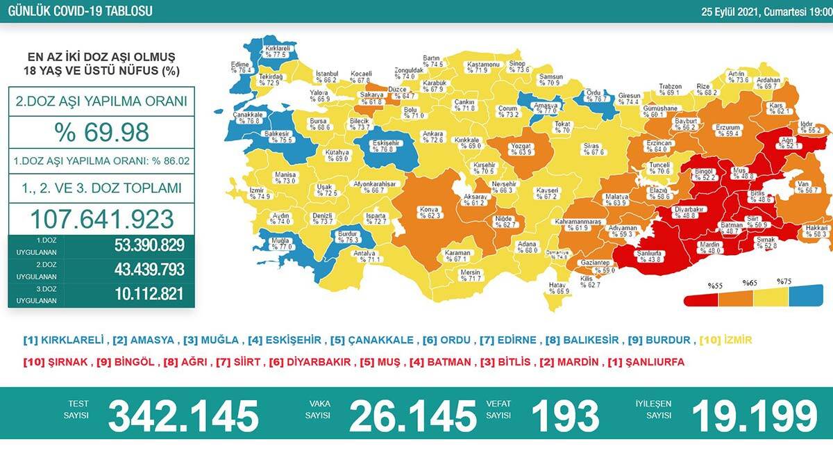 En az 2 doz aşı olmuş kişi oranının en yüksek olduğu iller; Kırklareli, Amasya, Muğla, Eskişehir, Çanakkale, Ordu, Edirne, Balıkesir, Burdur ve İzmir olurken 2 doz aşı olmuş kişi oranının en az olduğu iller ise Şırnak, Bingöl, Ağrı, Siirt, Diyarbakır, Muş, Batman, Bitlis, Mardin ve Şanlıurfa oldu.