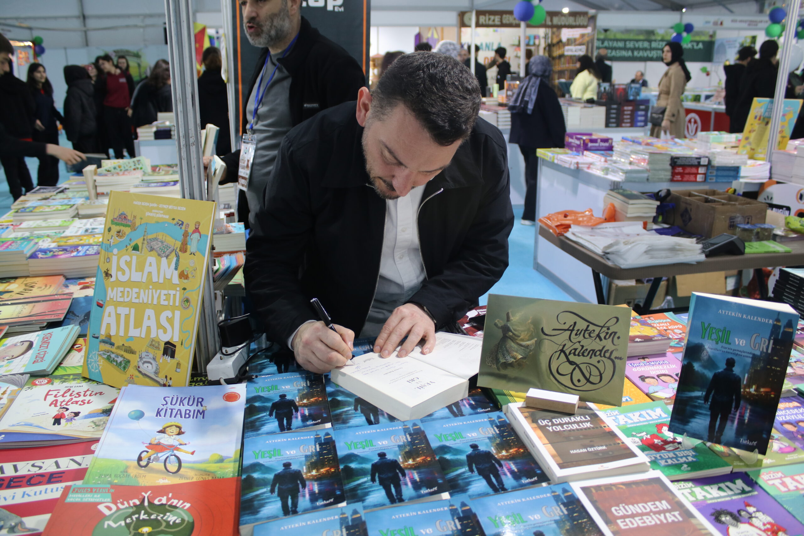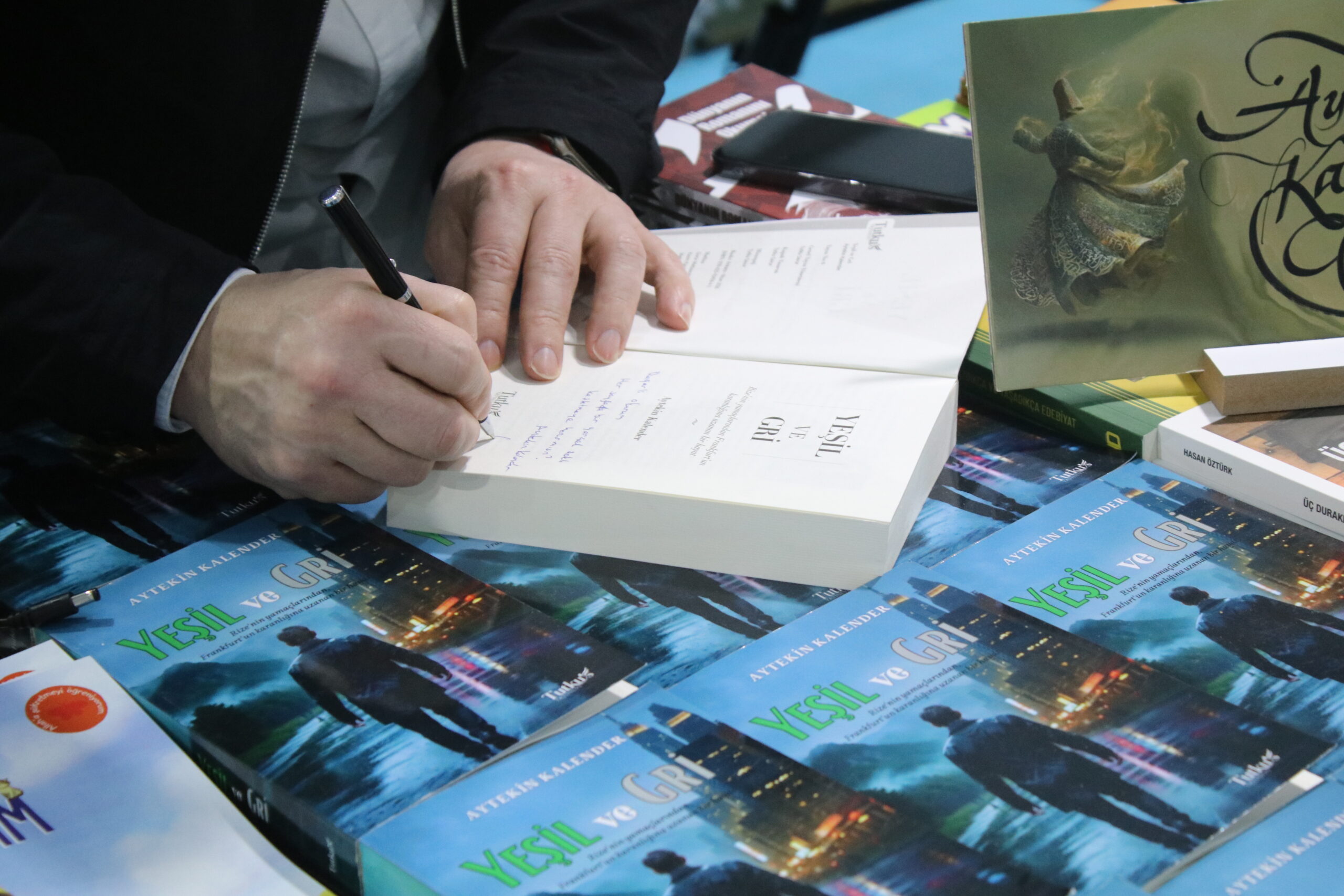 Doğu Karadeniz’de çektiği doğa fotoğrafları ilgi gören gazeteci yazar Aytekin Kalender, 2022 yılında haber takibi için gittiği bir köyde yanına gelen kişinin anlattıklarından yola çıkarak, roman yazdı. 1990’lı yıllarda Rize’de başlayıp Almanya’nın Frankfurt kentine uzanan aşk, hasret ve kaçış dolu gerçek bir hayat hikayesinin anlatıldığı ‘Yeşil Gri’ adlı roman, Rize Günleri etkinliğinde kitapseverlerin beğenisine sunuldu. Kalender’in ilk kitabı, okuyucuların ilgi odağı oldu.