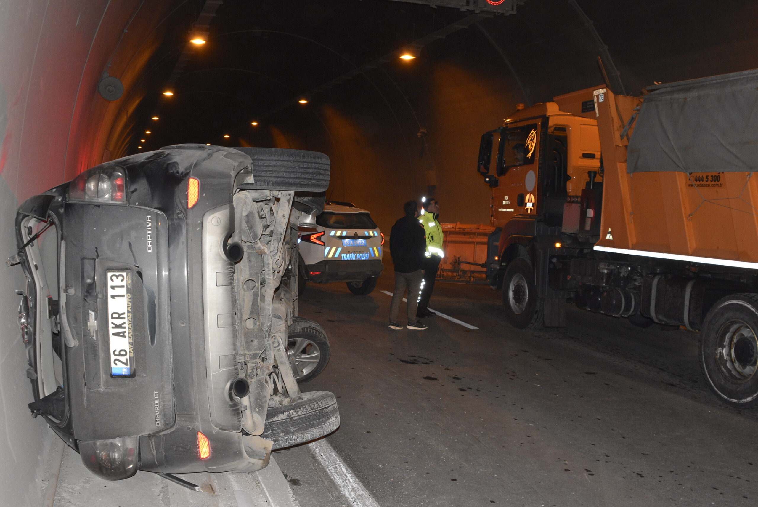 Kaza, saat 14.00 sıralarında, 8 Ağustos Tüneli’nde meydana geldi. Karayolları Tünel Şefliği ekiplerinin, tünel içerisindeki kameralardaki bakım çalışması sırasında, tedbir amaçlı bırakılan dubaları son anda fark eden sürücünün kullandığı 26 Akr 113 plakalı otomobil, manevra yaparken önündeki 12 Aag 700 plakalı hafif ticari araca çarptı. Otomobil kaldırıma çıkıp, takla attı. Kazada araçtaki Rıdvan Tan ve Hüseyin Tan yaralandı.