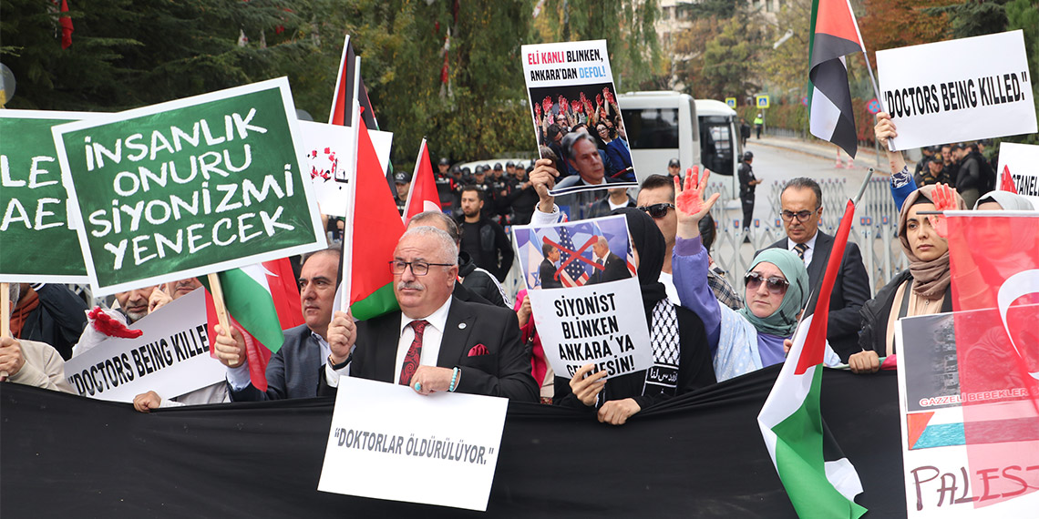 Grup adına açıklama yapan Cihannüma Dayanışma ve İşbirliği Derneği Ankara Temsilcisi Semih Okumuş, “Blinken’ın Amerika öncülüğündeki emperyalist güçlerin desteğini alan işgalci İsrail’in, Gazze’deki vahşi saldırılarının üzerinden bir ay geçti. Hiçbir hak ve hukuk tanımayan terörist saldırılar neticesinde binlerce masum çocuk, kadın ve yaşlı Filistinli şehit edildi ve yaralandı. İşgal rejiminin işlediği suçların doğrudan ortağı ve destekçisi olan ABD’nin Dışişleri Bakanı Blinken, işgali normalleştirmek ve sözde asrın anlaşmasındaki planlarını işletmek üzere pazarlık yapmak için an itibarıyla hükümet yetkilileri ile görüşüyor.