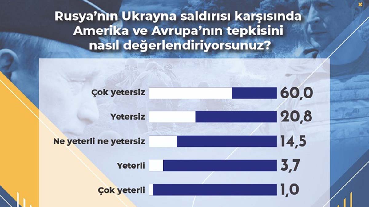 Areda’nın yönelttiği bir başka “Rusya’nın Ukrayna saldırısı karşısında Amerika ve Avrupa’nın tepkisini nasıl değerlendiriyorsunuz” sorusuna karşılık, araştırmaya katılanların yüzde 60’ı Amerika ve Avrupa’nın, Rusya’nın Ukrayna’ya saldırısı karşısında çok yetersiz kaldığını düşünürken, yüzde 20,8’i ise yetersiz kaldığını belirtti. Amerika ve Avrupa’nın çabalarını yeterli görenlerin oranı yüzde 4,7 gibi düşük düzeyde seyretti.