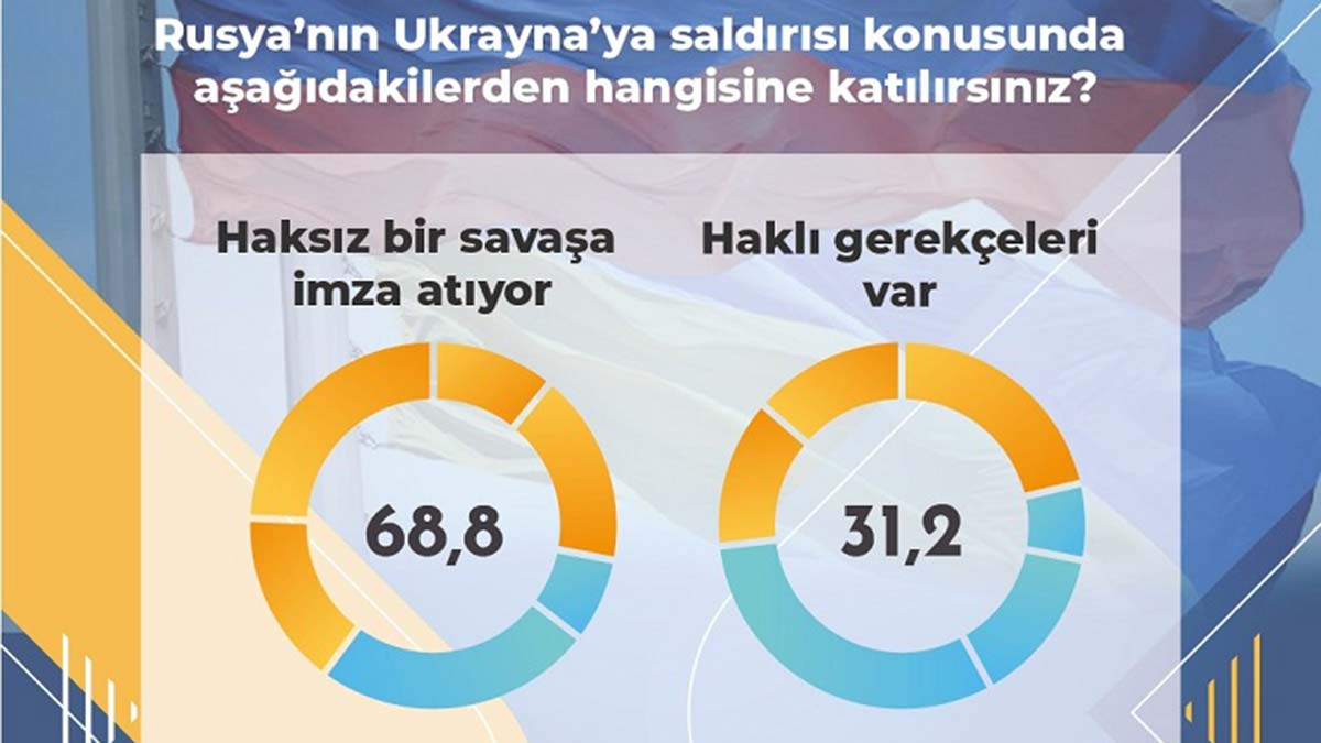 Araştırma sonuçlarına göre, katılımcıların yüzde 68,8’i Rusya’nın haksız bir savaşa imza attığını düşünüyor. Buna karşın katılımcıların yüzde 31,2’si ise Rusya’nın kendine göre haklı gerekçelerinin olduğunu ifade etti.