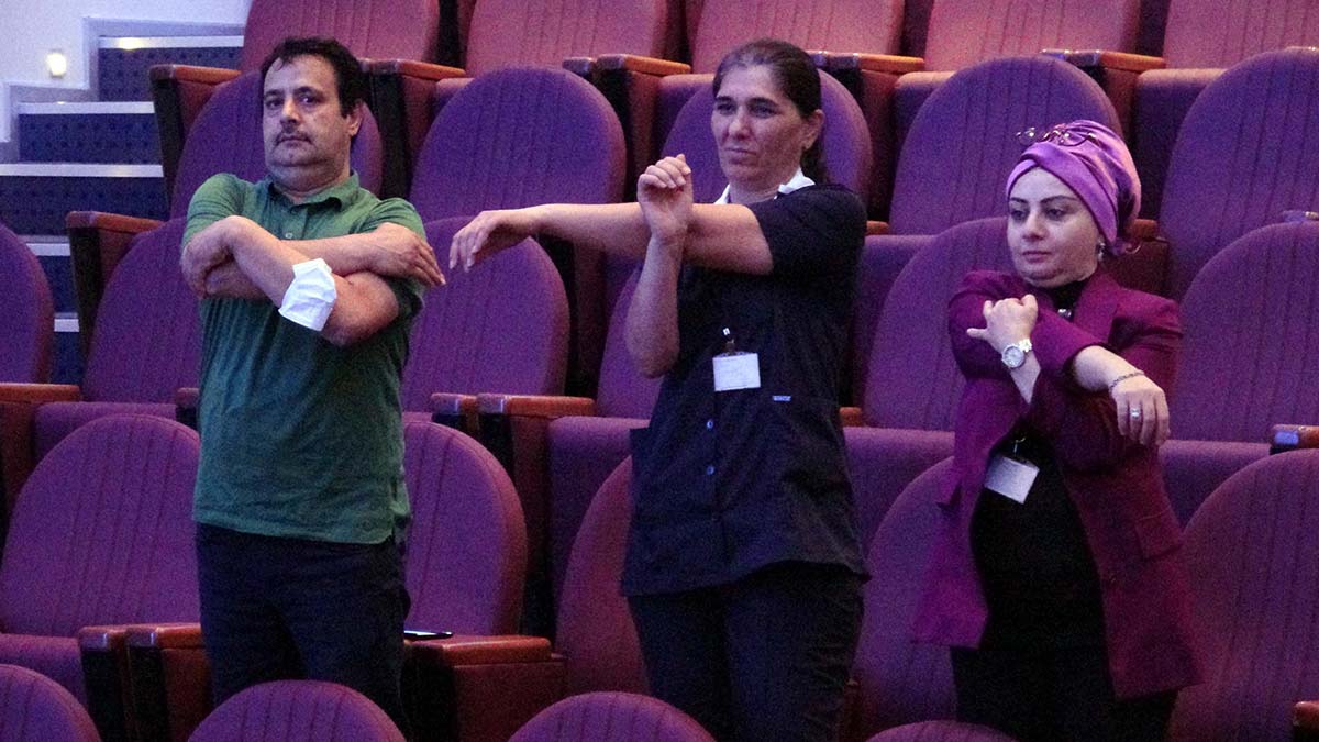 Kalaycı, salondaki izleyicilerden ayağa kalkmalarını isteyerek yaklaşık 2 dakika süreyle egzersiz yaptırdı. Konuşması sırasında da büro çalışanlarının yapabilecekleri hareketlerden örnekler gösteren Kalaycı, Hipokrat ve İbn-i Sina’nın, egzersizin önemine değindiklerini belirterek, insan anatomisi ve fizyolojisine gayet uyumlu olduğunu savunduklarını söyledi.