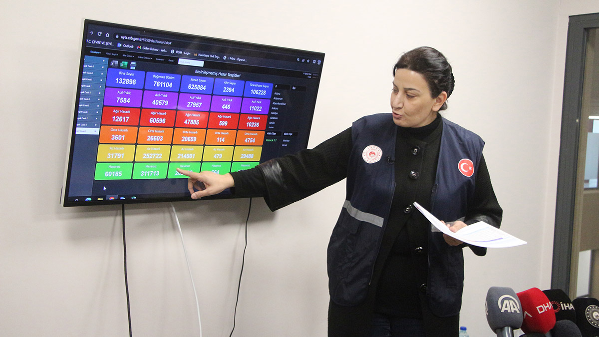 Aslan, “Kahramanmaraş merkezli depremin ardından etkilenen 10 ildeki hasar tespit çalışmalarımız 6 bin personel ile devam ediyor. İldeki hasarın durumuna göre personel sayımız değişiyor. Bu zamana kadar 10 ilde 132 bin 898 bina incelendi. Bu binalarda 761 bin 104 bağımsız bölüm incelenmiş oldu. Bu incelemeler içerisinde bina bazlı olarak 7 bin 584 adedi yıkık ya da acil yıktırılması gereken yapılar. 12 bin 617 adet yapıda ağır hasarlı yani oturulamaz kullanılamaz durumda olan yapı olarak tespit edildi. Bunların bağımsız bölüm olarak karşılığı da 100 bin bağımsız bölüme tekabül ediyor. Yani 100 bin bağımsız bölümde oturulması mümkün değil gibi gözüküyor’’ dedi.