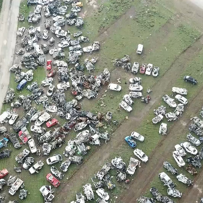 Kahramanmaraş merkezli depremlerin vurduğu Hatay’da yıkılan binaların enkazından çıkarılan araçlar, çekiciyle taşınıp Antakya ilçesinde, toplu araç mezarlığını andıran yediemin otoparkına çekiliyor. İki bine yakın aracın bulunduğu otoparktaki araçlar, şasi ve plakalarından tespit edilip, tescil belgesiyle gelen depremzedelerin kendisi veya birinci derece yakınlarına teslim ediliyor. Bugüne kadar 780 depremzedenin hasar gören aracını aldığı belirtildi. Otoparkta bulunan araçlar da dronla görüntülendi.