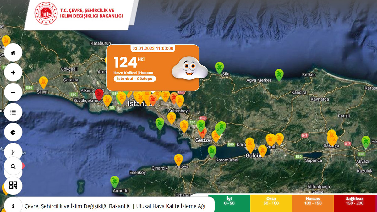 Renklerle uyarıların yapıldığı Çevre, Şehircilik ve İklim Değişikliği Bakanlığı’nın, “www.havaizleme.gov.tr” adresinde Türkiye’nin her bölgesinin hava kalitesi anlık olarak yayınlanıyor. Bu sitedeki verilere göre, hava kalitesi İstanbul’da Esenyurt kırmızı renkte sağlıksız olarak gözükürken, Kağıthane, Kadıköy Göztepe turuncu renkte hassas, Beşiktaş, Bağcılar, Başakşehir, Esenler, Avcılar, Üsküdar gibi ilçelerde de sarı renkte orta gözüküyor.