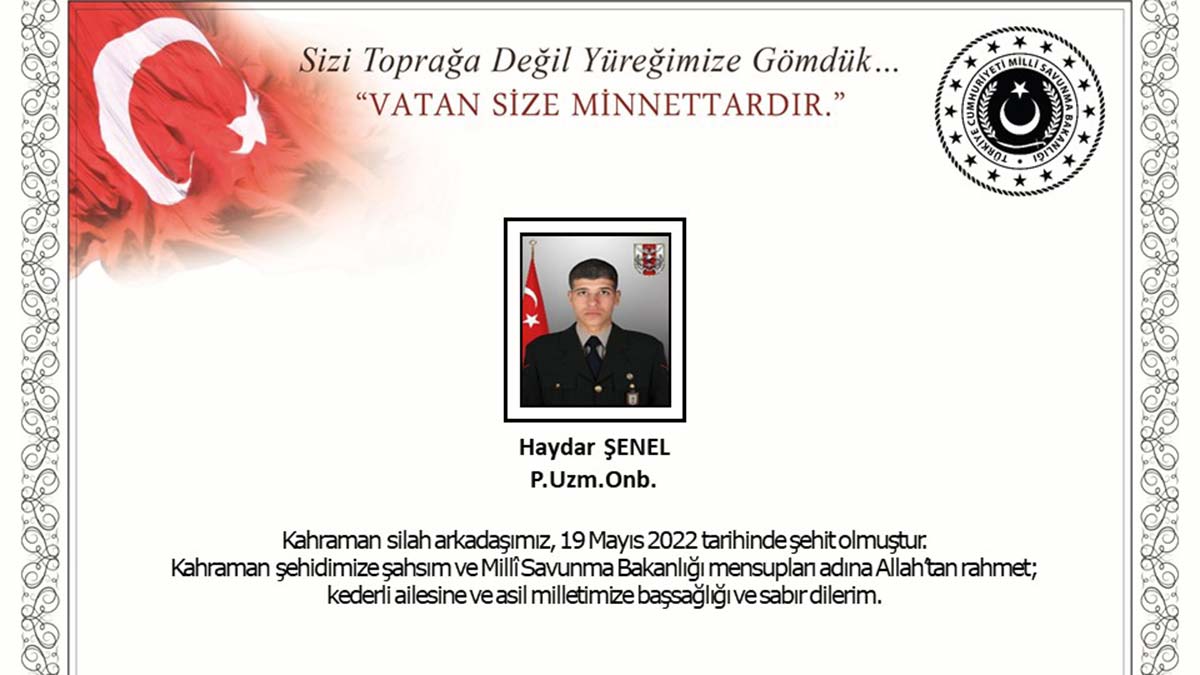 Bakanlıktan yapılan yazılı açıklamada, “Zeytin Dalı Harekat Bölgesinde, 13 Mayıs 2022 tarihinde teröristlerce yapılan havan saldırısı sonucu yaralanarak hastanede tedavi altına alınan Piyade Uzman Onbaşı Haydar Şenel, tedavi gördüğü hastanede yapılan tüm müdahalelere rağmen kurtarılamayarak 19 Mayıs 2022 tarihinde şehit olmuştur. Bizleri derin bir acı ve üzüntüye boğan bu olayda hayatını kaybeden aziz şehidimize Allah’tan rahmet, kederli ailesine, Türk Silahlı Kuvvetleri ile asil milletimize başsağlığı ve sabır, yaralı silah arkadaşımıza acil şifalar dileriz” denildi.