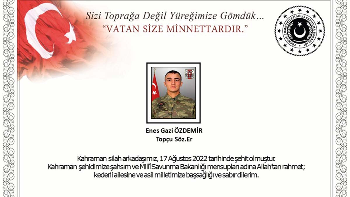 Bakanlıktan yapılan açıklamada, “Birecik/Şanlıurfa hududunda, 16 Ağustos 2022 tarihinde, teröristlerce yapılan havan tacizi sonucunda yaralanarak hastaneye sevk edilen kahraman silah arkadaşımız Topçu Sözleşmeli Er Enes Gazi Özdemir, yapılan tüm müdahalelere rağmen kurtarılamayarak 17 Ağustos 2022 tarihinde şehit olmuştur. Bizleri derin bir acı ve üzüntüye boğan bu olayda hayatını kaybeden aziz şehidimize Allah’tan rahmet, kederli ailesine, Türk Silahlı Kuvvetleri ile asil milletimize başsağlığı ve sabır dileriz” denildi.