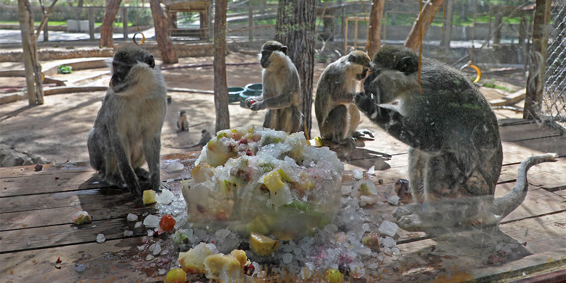 Doğal yaşam parkındaki görevliler, sıcaktan bunalan hayvanları özel hazırlanmış buz kalıpları içinde meyve ve sebze kokteylleriyle besliyor. Doğal yaşam parkındaki bozayı, lemur ve maymunların karpuz, portakal, kiraz, muz, elma gibi meyvelerden oluşan buzlu kokteylleriyle görüntüleri ziyaretçilerin ilgisini çekiyor. Parkta sıcaklara karşı kafeslere konulan fıskiye sistemi, havuzlar ve gölgelik alanlar aracılığıyla da hayvanların serinlemeleri sağlanıyor.