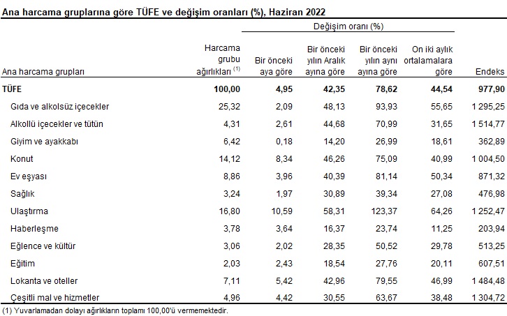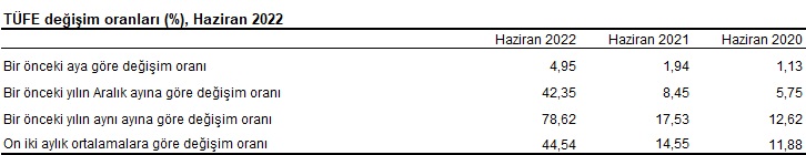 TÜFE’de (2003=100) 2022 yılı Haziran ayında bir önceki aya göre %4,95, bir önceki yılın Aralık ayına göre %42,35, bir önceki yılın aynı ayına göre %78,62 ve on iki aylık ortalamalara göre %44,54 artış gerçekleşti.