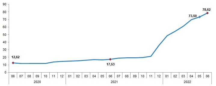 Türkiye İstatistik Kurumu (TÜİK) 2022 Haziran ayı enflasyon oranını açıkladı. Tüketici Fiyat Endeksi (TÜFE) yıllık %78,62, aylık %4,95 arttı.