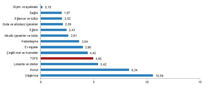 Yıllık en düşük artış %23,74 ile haberleşme ana grubunda gerçekleşti. Bir önceki yılın aynı ayına göre artışın düşük olduğu diğer ana gruplar sırasıyla %26,99 ile giyim ve ayakkabı, %27,76 ile eğitim ve %39,34 ile sağlık oldu. Buna karşılık, bir önceki yılın aynı ayına göre artışın yüksek olduğu ana gruplar ise sırasıyla, %123,37 ile ulaştırma, %93,93 ile gıda ve alkolsüz içecekler, %81,14 ile ev eşyası oldu.