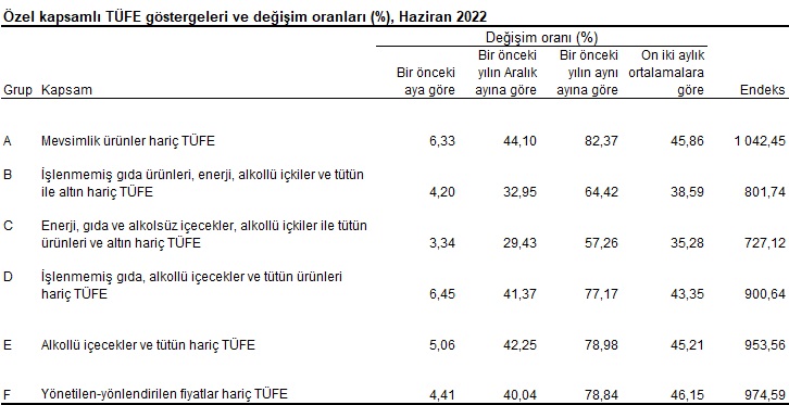 İşlenmemiş gıda ürünleri, enerji, alkollü içkiler ve tütün ile altın hariç TÜFE’de 2022 yılı Haziran ayında bir önceki aya göre %4,20, bir önceki yılın Aralık ayına göre %32,95, bir önceki yılın aynı ayına göre %64,42 ve on iki aylık ortalamalara göre %38,59 artış gerçekleşti.