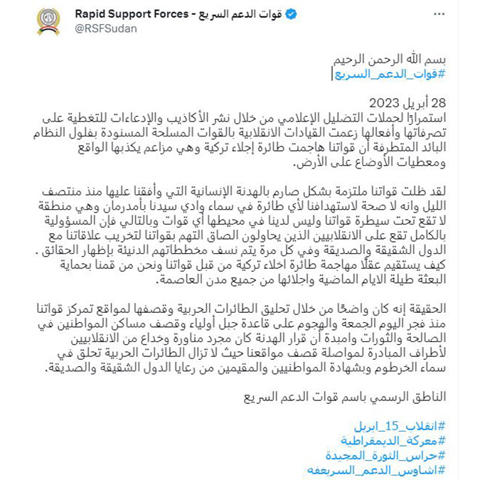 Hızlı Destek Güçleri dün akşam ilan edilen ateşkese ‘sıkı sıkıya’ bağlı kaldıkları vurgulayıp “Türk uçağını biz vurmadık” Türk tahliye uçağına güçlerimizin saldırması ne kadar mantıklı olabilir?” ifadelerine yer verdi.