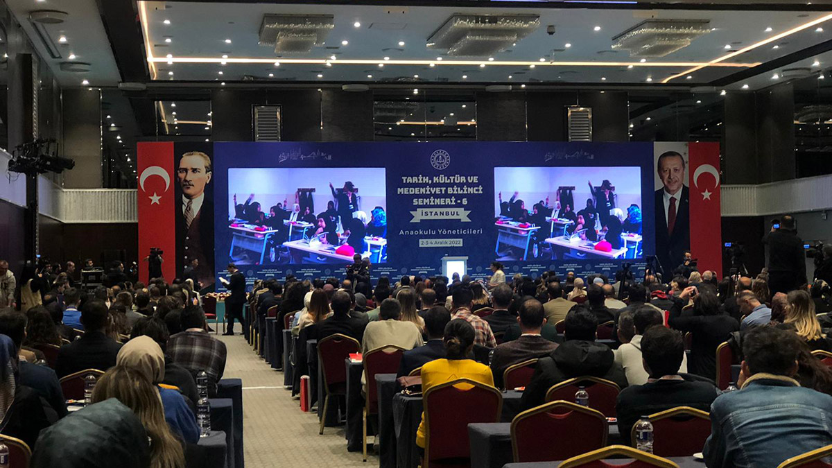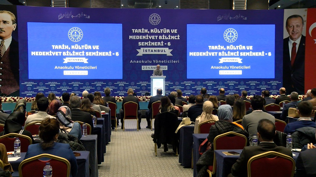 Ama gördük ki okullar bütçeyi kullanamıyorlar. 2020 yılında bu ülkede öğretmen başına ders saatini, eğitim saati sadece 44 saat 94 saate çıkarttık. 2022’de hedefimiz öğretmen başına 120 saatlik bir eğitimdi. Bunu 205 saate ulaştık. Muhtemelen 250 saate tamamlayacağız. Bugün de sizleri İstanbul’a davet etmemizin sebebi, sizlerin külür, tarih, medeniyetle ilgili seminerler almanızdır.