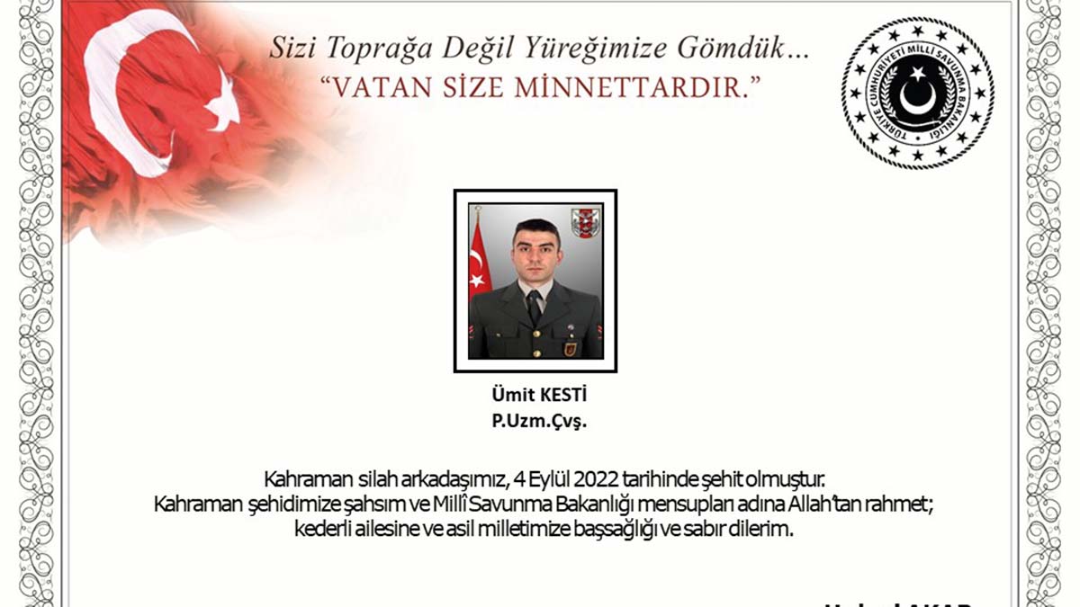 Milli Savunma Bakanı Hulusi Akar, Şehit Piyade Uzman Çavuş Ümit Kesti için yayımladığı başsağlığı mesajında, “Kahraman silah arkadaşımız, 4 Eylül 2022 tarihinde şehit olmuştur. Kahraman şehidimize şahsım ve Milli Savunma Bakanlığı mensupları adına Allah’tan rahmet; kederli ailesine ve asil milletimize başsağlığı ve sabır dilerim” dedi