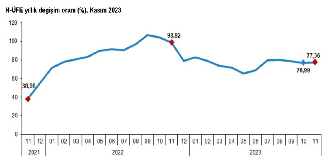 TÜİK, Kasım 2023 dönemine ilişkin hizmet üretici enflasyonuna işaret eden hizmet üretici fiyat endeksi (H-ÜFE) verilerini açıkladı. Buna göre ekimde yıllık yüzde 76,99, aylık yüzde 1,21 arttığı açıklanan H-ÜFE, kasım ayında yıllık yüzde 77,36, aylık yüzde 0,46 arttı.