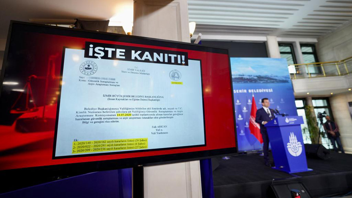 Toplantıda belge gösteren İmamoğlu, “İzmir Valiliği, Güvenlik Soruşturması ve Arşiv Araştırması Komisyonu 14 Temmuz 2020 tarihinde yaptığı toplantı ile bazı belediye çalışanlarının arşiv araştırmalarında sorun buluyor. Valilikteki komisyon yasa gereği bu bilgiyi önce İçişleri Bakanlığına gönderiyor, bunların işten çıkartılmasını isteyeceğiz onayınız var mı yazısı olarak bu yazıyı gönderiyor. Bakan işten çıkarılmalarına olur veriyor.