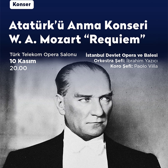 İDOB, Ulu Önder Mustafa Kemal Atatürk’ün vefatının 85. yılı olan 10 Kasım Cuma günü AKM’de konser verecek. Saat: 20.00’de başlayacak konserde; Wolfgang Amadeus Mozart’ın ‘Requiem’ eseri seslendirilecek. İstanbul Devlet Opera ve Balesi Orkestrası’nı İbrahim Yazıcı yönetirken, konserin koro şefliğini ise Paolo Villa üstleniyor. Konserin solistleri; Evren Işık Yasemin, Deniz Likos, Ufuk Toker ve Burak Bilgili.