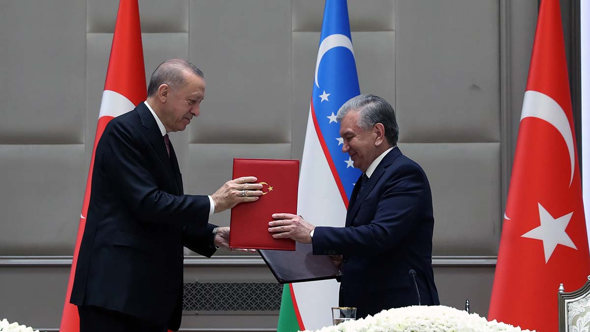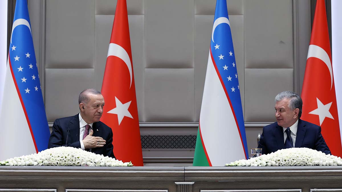 Resmi ziyaret kapsamında Özbekistan’da bulunan Cumhurbaşkanı Recep Tayyip Erdoğan, iki ülke arasında imzalanan ticaret hedefi sonrasında Özbekistan Cumhurbaşkanı Şevket Mirziyoyev’le ortak basın toplantısına katıldı.