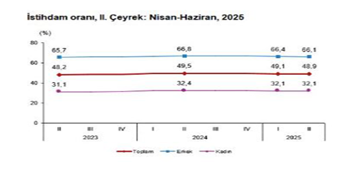 İstihdam edilenlerin sayısı 2025 yılı 2’nci çeyreğinde bir önceki çeyreğe göre 41 bin kişi azalarak 32 milyon 435 bin kişi, istihdam oranı ise 0,2 puanlık azalış ile yüzde 48,9 oldu. Bu oran erkeklerde yüzde 66,1 iken, kadınlarda yüzde 32,1 olarak gerçekleşti. İş gücü, 2025 yılı 2’nci çeyreğinde bir önceki çeyreğe göre 65 bin kişi artarak 35 milyon 469 bin kişi, iş gücüne katılma oranı ise değişim göstermeyerek yüzde 53,5 olarak gerçekleşti. İş gücüne katılma oranı erkeklerde yüzde 71,1, kadınlarda ise yüzde 36,3 oldu.