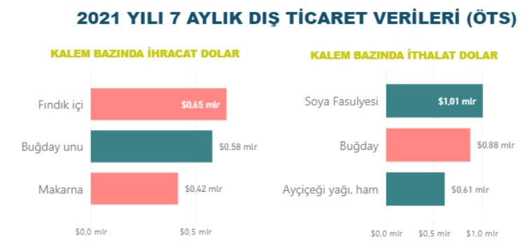 Tek başına hayvan yemi sektörü, 2021’in ilk 7 ayında 2,5 milyar doları geçen hacim ile toplam ithalatın yüzde 27,2’sini, 4’te 1’inden fazlasını oluşturdu. Bitkisel yağ sektörü, 2021’in ilk 7 ayında 1.733 milyon dolarlık ithalat ile toplam ithalatın yüzde 18,8’ini oluşturdu.