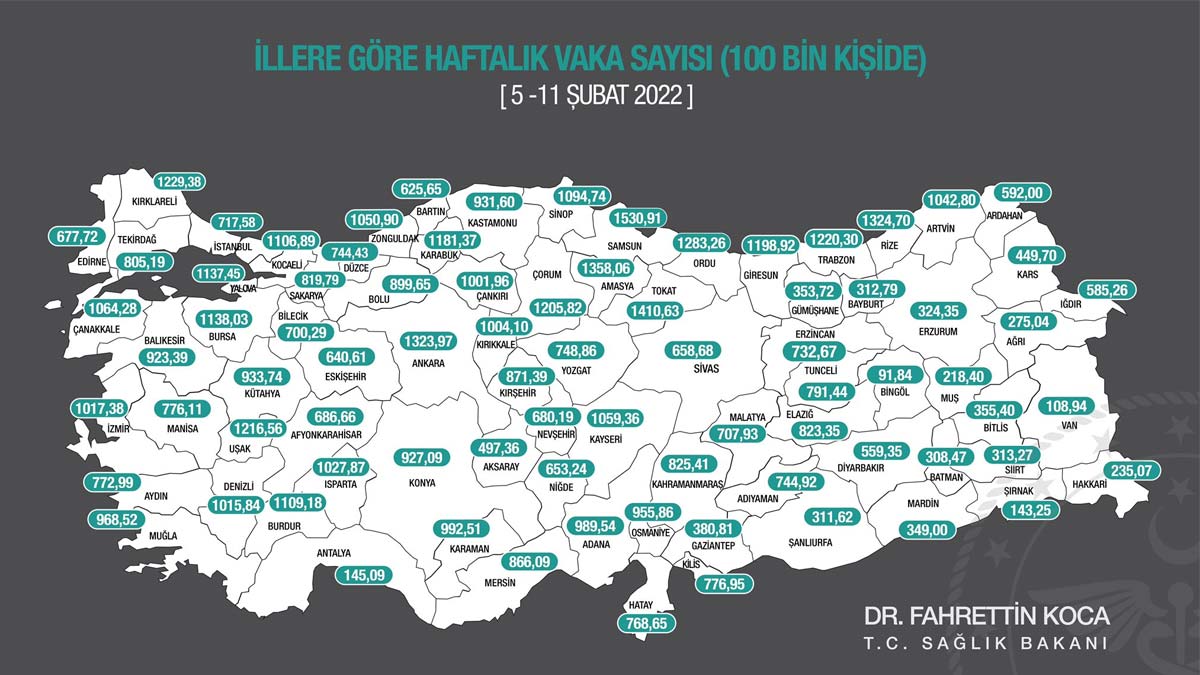 Sağlık Bakanı Fahrettin Koca, Twitter hesabından Covid-19‘da 5-11 Şubat’ı kapsayan, illere göre haftalık vaka sayısı haritasını paylaştı. Haritaya göre; İstanbul’da 100 bin kişide görülen vaka sayısı son 1 haftada 894,82’den 717,58’e, İzmir’de ise 1229,37’den 1017,38’e düştü; Ankara’da da 1279,73’ten 1323,97’ye yükseldi. Haritaya göre, vaka yoğunluğu en az olan iller; 108,94 ile Van, 143,25 ile Şırnak ve 145,09 ile Antalya oldu.