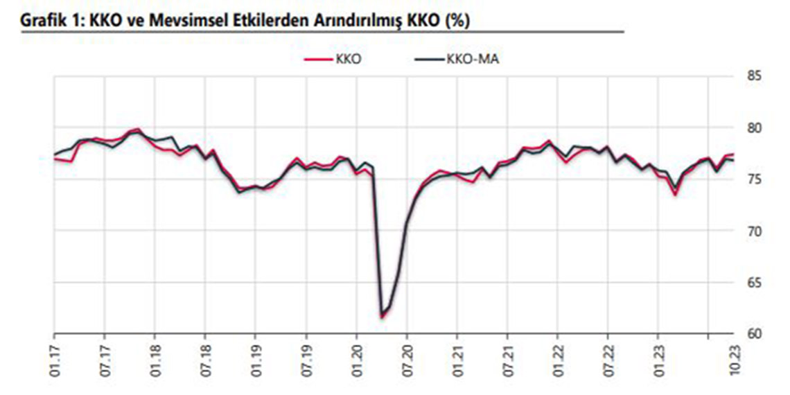 TCMB, Ekim 2023 dönemine ilişkin imalat sanayi kapasite kullanım oranlarını açıkladı. İmalat sanayinde faaliyet gösteren 1727 iş yeri tarafından İktisadi Yönelim Anketi’ne verilen yanıtlara göre; imalat sanayi genelinde mevsimsel etkilerden arındırılmış kapasite kullanım oranı, bir önceki aya göre 0,1 puan azalarak yüzde 76,8 seviyesinde gerçekleşti. Mevsimsel etkilerden arındırılmamış kapasite kullanım oranı ise bir önceki aya göre 0,1 puan artarak yüzde 77,4 seviyesinde gerçekleşti.